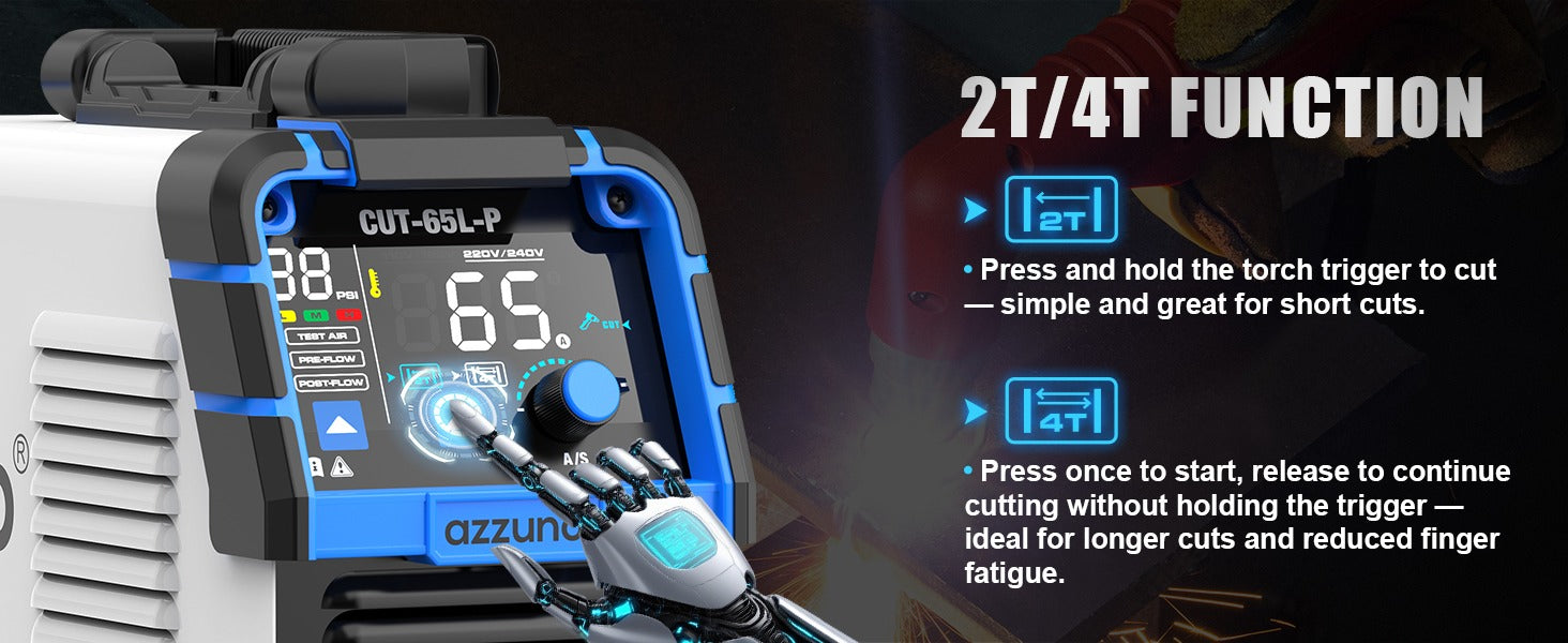 The AZZUNO CUT-65L-P plasma cutter delivers high-performance cutting with a 65A output and non-touch pilot arc technology. Designed for precision and efficiency, it handles steel, stainless steel, aluminum, and more with ease, offering dual voltage flexibility and advanced control for both DIY users and professional workshops.